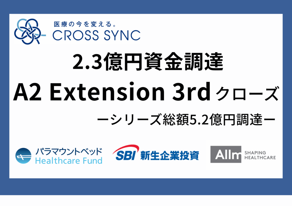 CROSS SYNC(代表取締役:髙木俊介・中西彰、以下「当社」)は、パラマウントベッド株式会社(代表取締役 社長執行役員:木村友彦)、SBI新生企業投資株式会社(代表取締役社長:植坂謙治)、株式会社アルム(代表取締役社長兼CEO:大谷駿明)を引受先とする第三者割当増資により2.3億円の資金調達を実施し、シリーズA2エクステンションのサードクローズを完了いたしました。